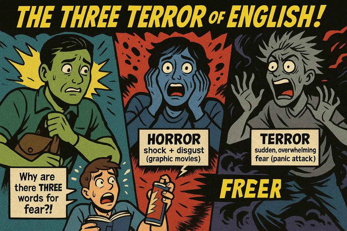 英語には「fear」「horror」「terror」といった、いずれも「恐怖」を意味する語が複数存在します。これらの単語は一見似ているように見えますが、それぞれが指す恐怖の質や強さ、使われる文脈には明確な違いがあります。 例えば、日常的な不安や心配を表す... -