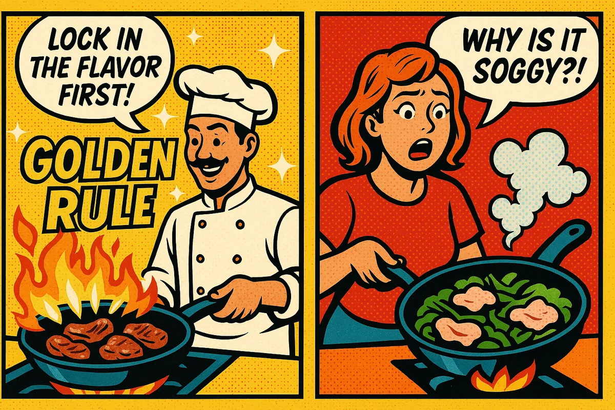 さらに、肉の表面に焼き色をつける「メイラード反応」によって、香ばしさやコクが生まれます。この反応は高温でなければ成立しにくく、野菜から炒めて水分が出てしまうと温度が下がり、肉に十分な焼き色がつかなくなることがあります。
