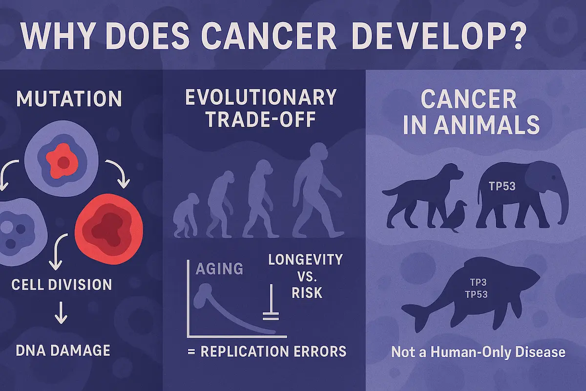 進化の視点では、生殖年齢に達するまでの生存と繁殖の成功が最優先される。がんの多くは中高年以降に発症するため、繁殖に直接影響を及ぼさない限り、進化的には淘汰圧がかからない。つまり、がんになりやすい体質があっても、若くして子孫を残していれば、それが自然選択によって排除されることはない。