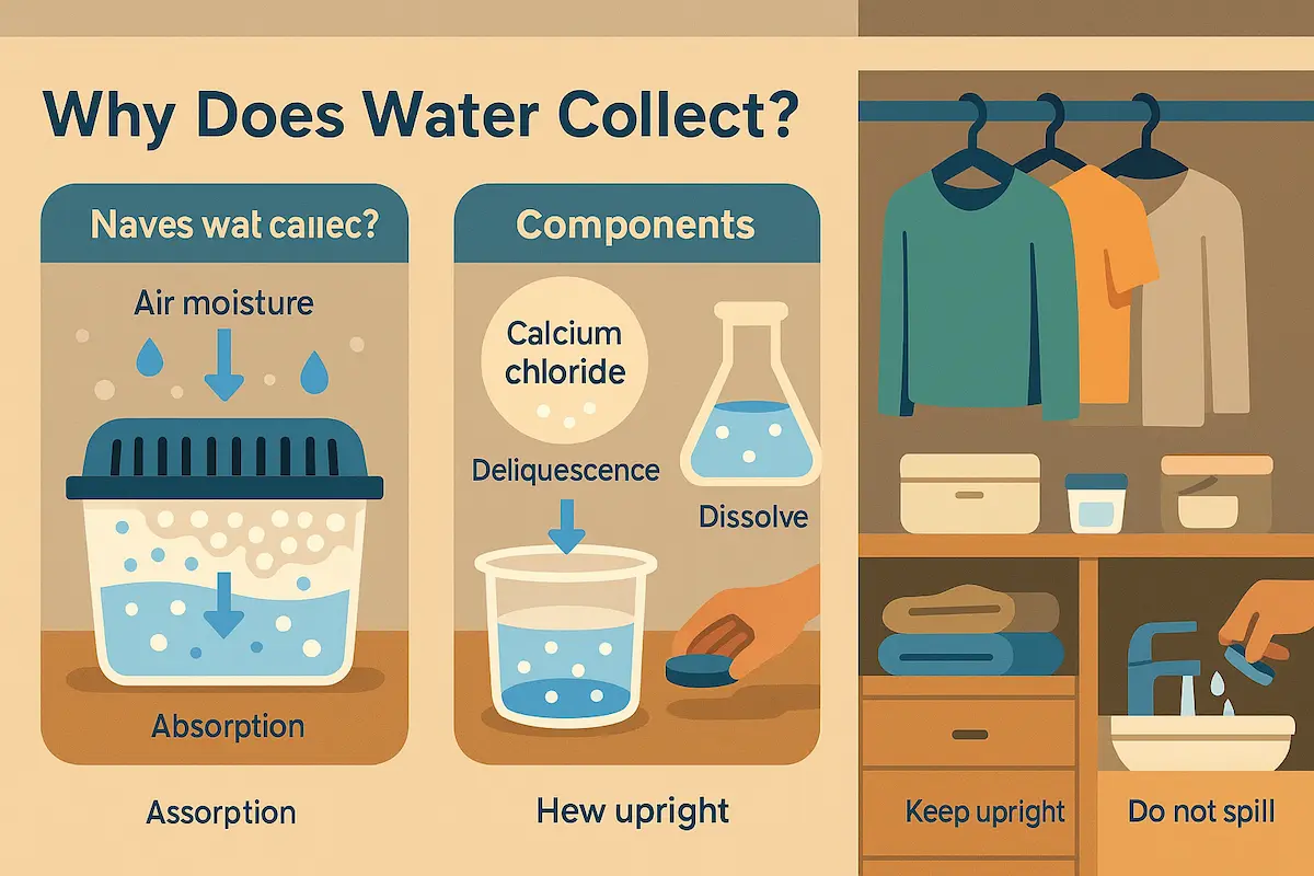 除湿剤に水が溜まる現象は、吸湿性成分が空気中の水分を取り込み、それを液体として分離・蓄積する一連の過程によって起こる。ここでは、塩化カルシウムタイプを例に、その流れを段階的に説明する。