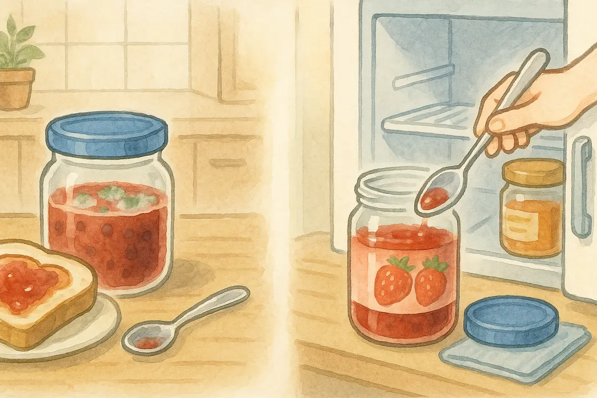 さらに、ジャムを塗る際にパンくずやバターなどが混ざると、糖の濃度が局所的に下がり、カビの繁殖条件が整いやすくなります。冷蔵庫で保存していても、温度変化や表面の結露によって微生物が活動できる環境が生まれることがあります。